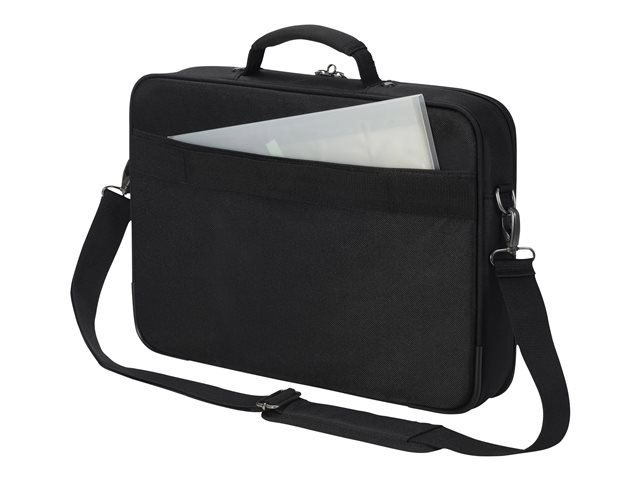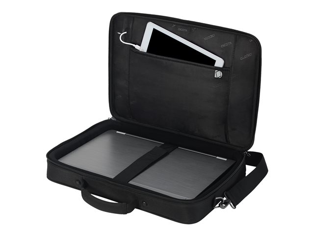 Le compartiment principal refermable à clapet protège votre ordinateur portable de 14 à 15,6" avec un rembourrage complet en mousse haute densité (HDF) et Nylex souple, à un cadre renforcé de métal et à une fixation fiable avec une sangle. Votre tablette jusqu'à 10,5" est également casée en toute sécurité dans sa poche spéciale rembourrée. La poche avant spacieuse permet de mettre de l'ordre avec son compartimentage fonctionnel pour smartphone, batterie externe, stylos et autres accessoires. Un compartiment supplémentaire zippé sur la partie inférieure avant du sac permet de ranger le chargeur et les câbles. La poignée de forme ergonomique et rivetée, une sangle avec renfort rembourré aux épaules réglable en longueur ainsi que la lanière de fixation trolley au dos permettent une utilisation flexible et garantissent un transport confortable.