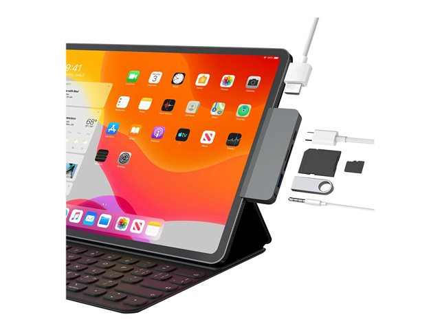 Hub USB-C de forme adaptée pour l'iPad Pro, l'iPad Air et l'iPad mini 6. Cette station d'accueil USB-C se fixe sur le côté de l'iPad en ajoutant 6 ports : Sortie HDMI 4K 60Hz, alimentation USB-C, et plus encore.