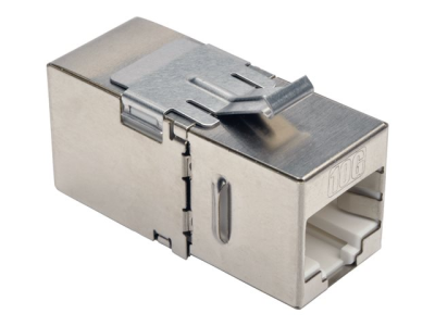 Tripp Lite Cat6a Straight Through Modular Shielded In Line Coupler RJ45 F/F - Coupleur réseau - Conformité TAA - RJ-45 (F) pour RJ-45 (F) - STP - CAT 6a - connecteur à 90°, connecteur à angle vers le bas - argent