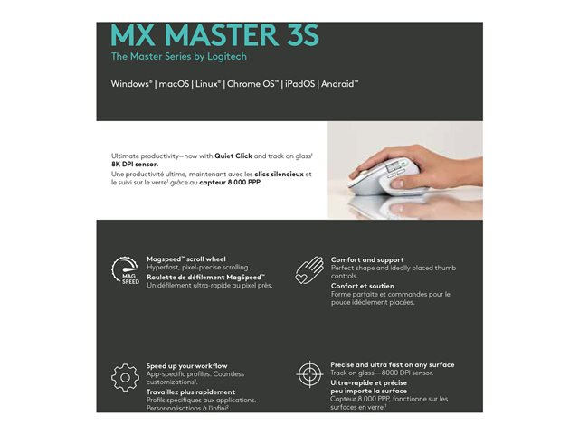 | Caractéristiques | Logitech Darkfield Laser Tracking, technologie Easy-Switch, fonction gestuelle, batterie rechargeable, repose-pouce, roue MagSpeed, DPI personnalisable, molette, technologie Quiet Clicks |