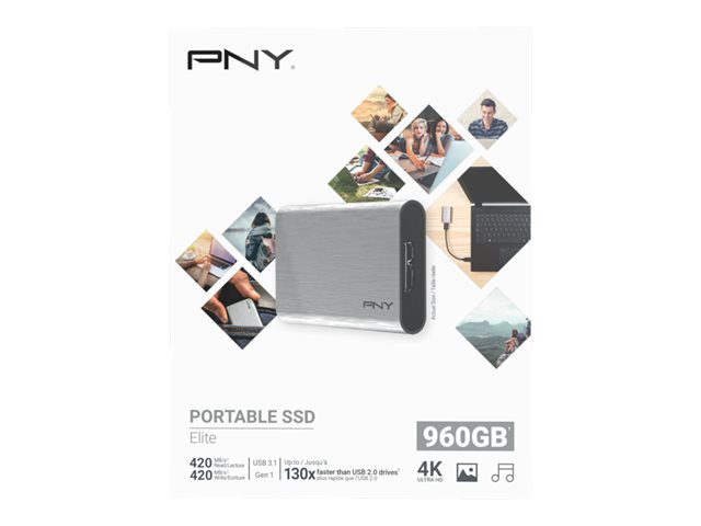 PNY ELITE - SSD - 960 Go - externe (portable) - USB 3.1 Gen 1 - argent brossé