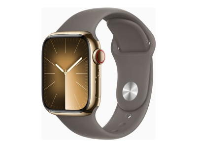 Apple Watch Series 9 (GPS + Cellular) - 41 mm - acier inoxydable doré - montre intelligente avec bande sport - fluoroélastomère - argile - taille du bracelet : S/M - 64 Go - Wi-Fi, LTE, UWB, Bluetooth - 4G - 42.3 g MRJ53QF/A