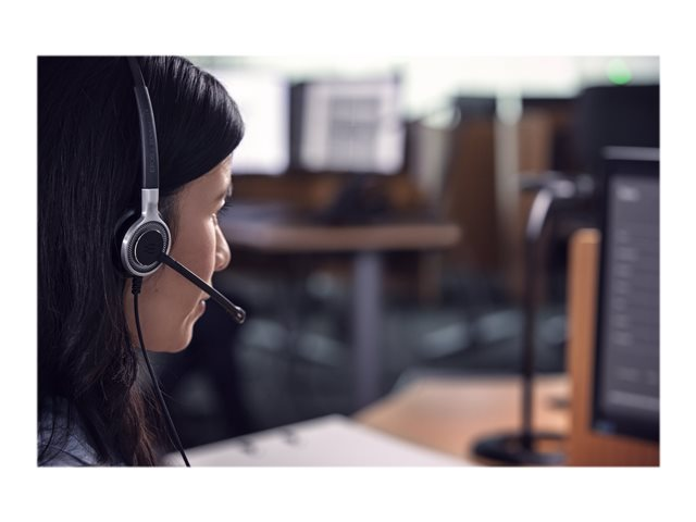 Micro-casque filaire USB binaural avec réduction de bruit active et capteur de proximité. Cette solution pour centres de contacts et bureaux vous offre un son supérieur, un traitement simplifié des appels, une grande résistance et un confort prolongé.