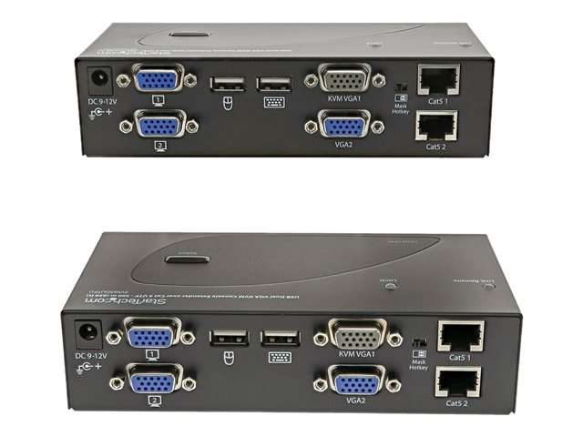 L'extendeur KVM double VGA sur Cat5 prend en charge les boutons poussoirs et les raccourcis clavier d'utilisation facile, qui vous permettent de permuter entre les systèmes connectés localement et à distance, alors que les branchements de console aux deux extrémités de votre configuration offrent un accès facile à tous les systèmes connectés aux deux endroits. Les raccourcis clavier permettent également de régler la vidéo pour optimiser la qualité de l'image sur diverses distances. L'extension sur deux câbles standard Cat5 (ou plus) vous permet d'utiliser le câblage existant afin d'assurer l'accès à distance à votre serveur ou à votre commutateur KVM.